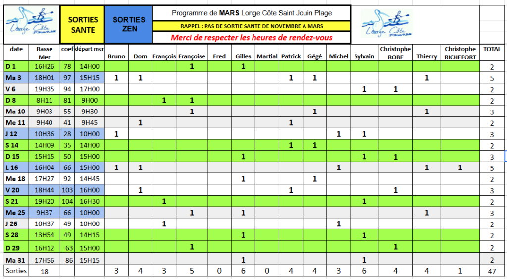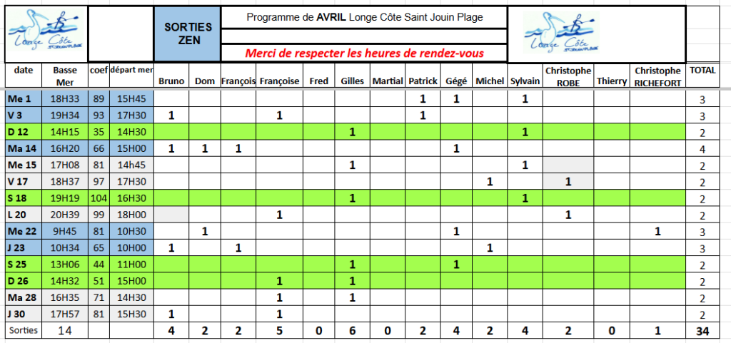 Et bien sûr le calendrier mensuel des sorties que nous proposons toute l’année et toujours à marée basse, cailloux et galets obligent !